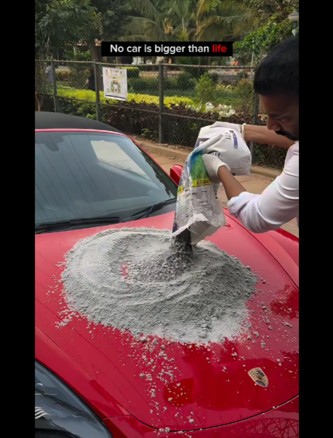 그런데 최근 이 상식을 완전히 뒤집는 장면이 등장했다. 한 남성이 포르쉐 박스터의 보닛 위에서 시멘트를 모래와 직접 섞는 영상이 공개된 것이다. 처음 보면 차량을 일부러 훼손하는 것처럼 보이지만, 실제 의도는 정반대였다.